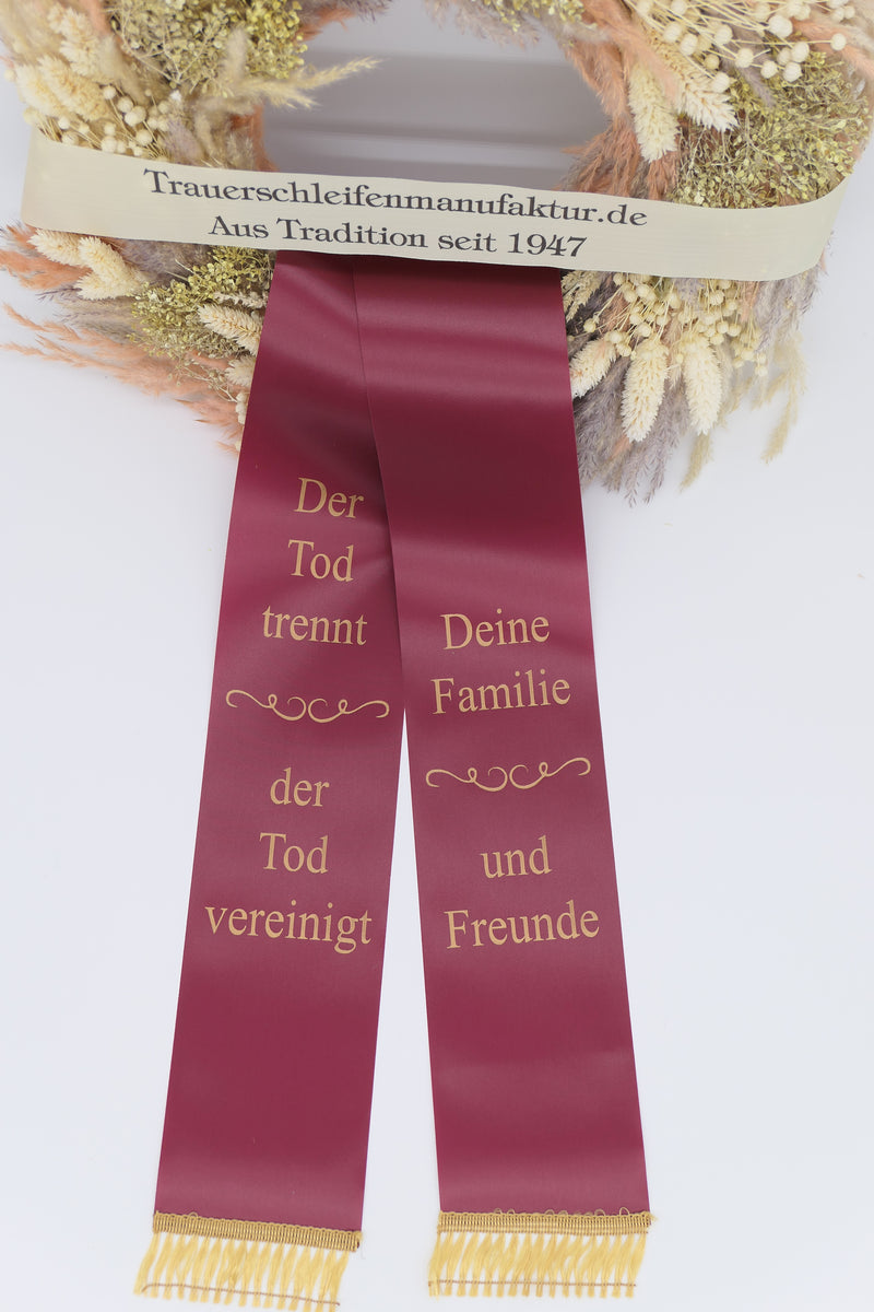 Alle Trauerschleifen werden direkt vor Ort gefertigt und mit größter Sorgfalt hergestellt. Jede Schleife wird individuell geprüft, um höchste Qualität und ein perfektes Ergebnis zu gewährleisten. So entsteht ein würdevoller letzter Gruß, der sowohl optisch als auch inhaltlich überzeugt.