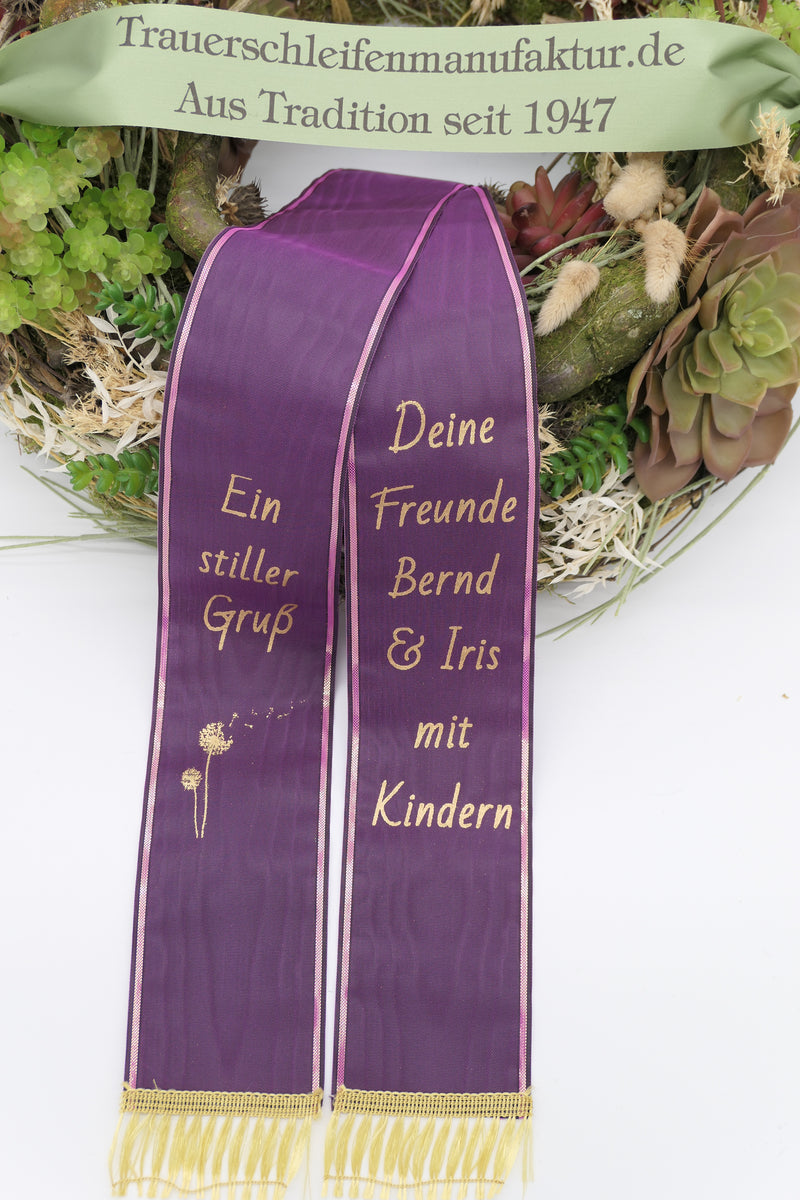 Trauerschleifen individuell gestalten bedeutet, eine persönliche Botschaft stilvoll zum Ausdruck zu bringen. Ob klassisch, modern oder mit besonderen Symbolen – jede Kranzschleife wird nach Wunsch gefertigt und sorgt für einen würdevollen letzten Gruß.
